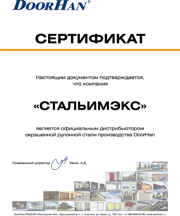 Компания является официальным эксклюзивным дистрибьютером окрашенной рулонной стали завода «ДорХан», что подтверждено сертификатом.